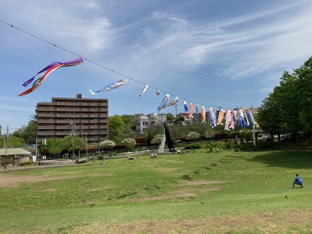 今年も清水坂公園の中央で「大きなひろば」で、皆さまから寄贈いただいたこいのぼりの掲揚が始まりました。